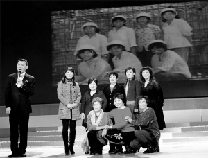 胡一虎手指处,6位姐妹走上台来。刘穗芳惊喜地和姐妹们拥抱在一起。