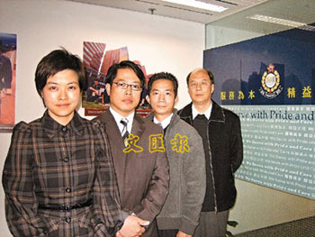 李雅丽(左一)指出,为防止青少年误入歧途,特区政府已增拨资源,在全港中小学、大专院校及专上学院等,新增27名学校联络主任,令学校联络主任人数增至85人。叶利兴(左二)及潘元启(右一)是其中两名联络主任。(图片来源:文汇报)