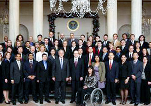 2007年度美国青年科学家总统奖获奖人在白宫合影;第二排布什总统右后者为汪海燕校友。(图片来源:美国白宫官方网站)