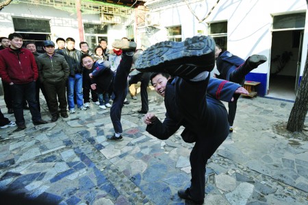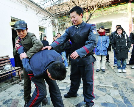 天气很冷,院子里却是一片热火朝天。四个20岁上下的小伙子在教几位市民学习简单的擒拿格斗,有招有式。“乍开始,还怕自己学不会,原来手把手教起来,也不难学啊!而且看起来简单,这招式还挺实用。”说话的同时,市民刘先生用巡防队员教他的招式,一把将对练的巡防队员按倒在地。