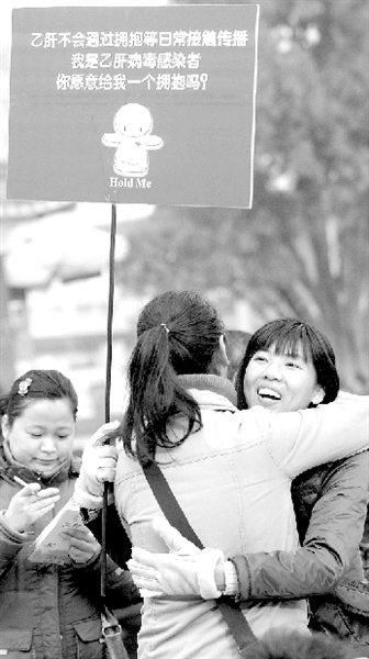 “我是乙肝病毒感染者,你愿意给我一个拥抱吗?” 昨日下午,二七广场,举着牌子的乙肝病毒携带者热切地走向每一个陌生人,希望索取一个拥抱,两小时内82位给了拥抱,19位拒绝。这是我国第一次乙肝“抱抱团”公益活动。