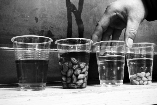 (昨日,将不同地点购买的花生米泡在清水中后,马王堆菜市场内购买的红皮花生米迅速将水染红,韶山南路地下通道内购买的花生米则没有褪色。图/记者陈斌)