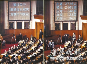 3月14日下午3点54分,是三千万重庆人民永远铭记的时刻:重庆成为中国第四个直辖市。第八届全国人民代表大会第五次会议审议了国务院关于提请审议设立重庆直辖市的议案,2720位人民代表投下了自己庄严的一票,表决结果是:赞成2403票,反对148票,弃权133票,36人未按,赞成票过半。有着3000多年历史的古城重庆,在世纪之交掀开了新的一页。