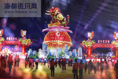 进入白鹭洲西公园大门,首先映入眼帘的是一组大型彩灯造型,一个数米高的大红灯笼让喜庆的节日气氛扑面而来。2009年是“牛”年,现场一头造型别具一格的“牛”,更是引人注目,牛气冲天。届时,“金牛”还要“站”在大灯笼上,来观灯的人们,老远就可以看到它。