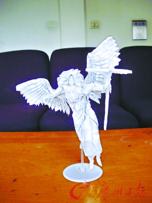 让人意外的是,最花费时间和精力的不是“折纸”这个步骤。“在造型美观上,我花费的时间最多。” 张弛说。他表示,不是把草图上的造型折好,就算完成了的。“仅仅是繁复的程序,还称不上是一件很理想的艺术品,必须要有一些艺术造型,才算是成功的艺术品。” 张弛花费大量的时间在定型、美观、保养等方面。“天使上的每一根羽毛,我都要下一点定型液,使它更硬,不容易松散。还要在整个天使的纸面上,喷洒一些保养剂,防止纸质变坏,失去原有的造型效果。”