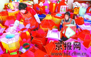 本报讯(通讯员刘雪梅 记者杨晓斌)昨天,几辆装满各式灯笼的大卡车,排着队驶出了怀柔区九渡河镇红庙村。春节前,红庙村接到灯笼制作订单2万个,灯笼订单金额已达20多万元,村民年收入增加6000多元。