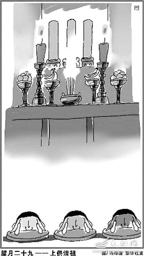 腊月的最后是三十之夜的守岁,这夜称“除夕”。“除”的本意是“去”,引申为“易”,即交替;“夕”的本意是“日暮”,引申为夜晚,除夕就是一年中的最后一夜,含新旧交替之意。它源于先秦的“逐除”。《吕氏春秋》说,古人在新年前的一天击鼓驱逐“疫疠之鬼”。西晋周处《风土记》最早言为“除夕”。《东京梦华录》记载:除夕时“土庶之家,围炉而坐,达旦不寐,谓之守岁”。如今的守岁之夜,家家户户吃团圆饭、看春晚,欢乐的内容、团圆的形式一年比一年丰富了。