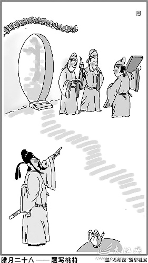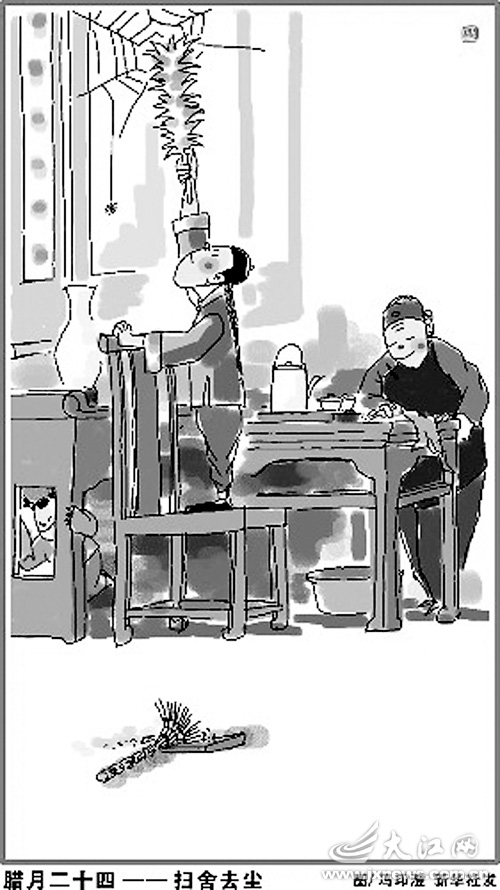 祭灶之后是扫尘。扫尘起源于古代一种驱除病疫的宗教仪式,时间在腊月二十四。《秘奥造宅经》载:“沟渠通浚,屋宇洁净”,就能“无秽气,不生瘟疫”。此习俗尧舜时已有,唐宋时盛行。《梦梁录》里就说:“十二月,土庶家不论大小,俱洒扫门闾,去尘秽,净庭户,以祈新岁之安。”因此说春节前的大扫除,当是中华民族的文明传统。然后是腊月三十贴春联。春联起源于“桃符”,春节挂桃符的习惯从战国开始,到唐代和五代日盛,但这时的桃符已改为联语,所以,桃符就改称春联了。春联一贴,那彤红的大年初一可就真的要来了。
