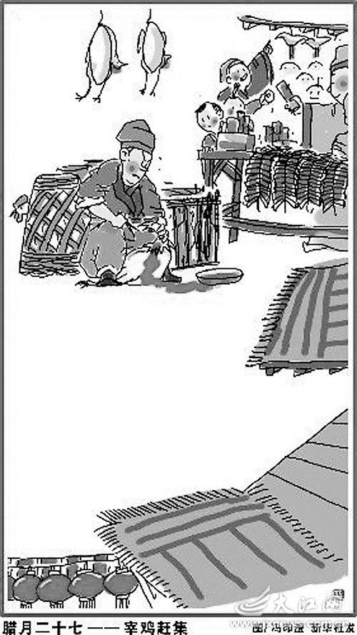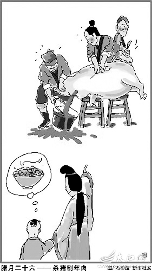 腊月是一幅色彩斑斓的民俗画。吃过“腊八粥”,就该忙年了。腊月二十四,是小年日,也是“扫尘日”。这一天,家家户户用青竹叶扎成扫把,打扫高处的尘埃蛛网,掸去春台桌椅板凳的灰尘,开始除旧布新,迎接新春。腊月里,乡下娶亲嫁女喜事连连。村东的嫂子们给“回门婿”打红,新女婿的脸被打得像红关公,嫂子们还嫌不过瘾,让丈爷、丈娘也“带了彩”。村西的小伙子正在盘新娘、新郎。新郎前面乐呵呵地笑,新娘后面羞得低下了头。