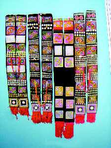 藏族着皮袍必有腰带,腰带为织物带子或皮带,织物图案纹样主要来源于各种自然形象及几何原理纹样,包括植物(花草叶果等)、动物、天文地理现象(日月星云水石等)、吉祥寓意的传统纹样、组合器物纹样等,常见的有雍仲符、日月符、加珞等。