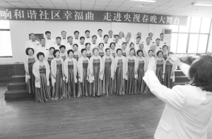 1月19日上午,沈阳市大东区文化馆,48名社区老年合唱团的队员们正在紧张排练。墙上挂着醒目的条幅:“唱响和谐社区幸福曲,走进央视春晚大舞台”。