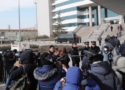 昨日,人们在石家庄中院门前等待三鹿案审判结果。新华社 王民 图
