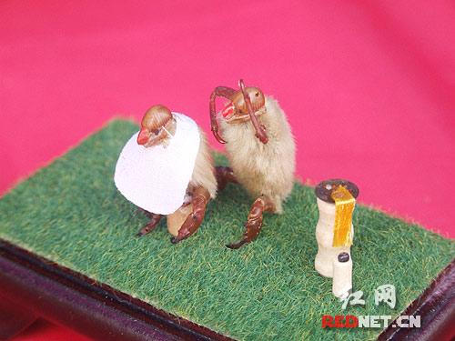 和毛猴的制作工序相比,其材料更显得弥足珍贵。毛猴的四肢是用蝉蜕的四肢做成的,身体是另一味中药———辛夷,也就是玉兰花在秋天里形成的花骨朵,毛猴的头用的是蝉蜕的头,正好与花骨朵相配。毛猴有时会戴斗笠,这斗笠也是一味中药,叫木通。制作毛猴的粘结剂则是用富有粘性的白芨,都是纯天然材料。“平时肖掌柜一般负责‘创意’”。吕铁智介绍说,比如前不久肖掌柜依照中国大剧院为题材,设计了一套毛猴在音乐会上演奏西洋乐器的场景,反响很好。