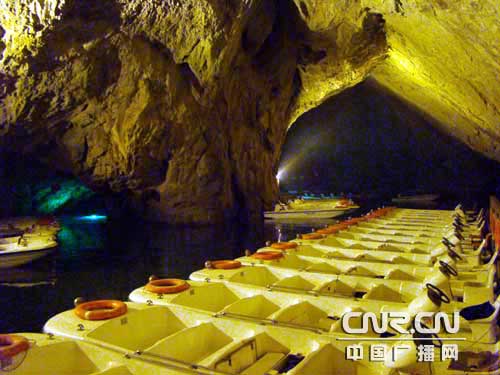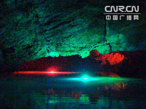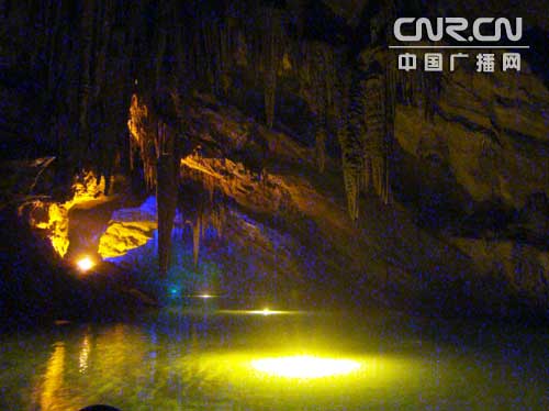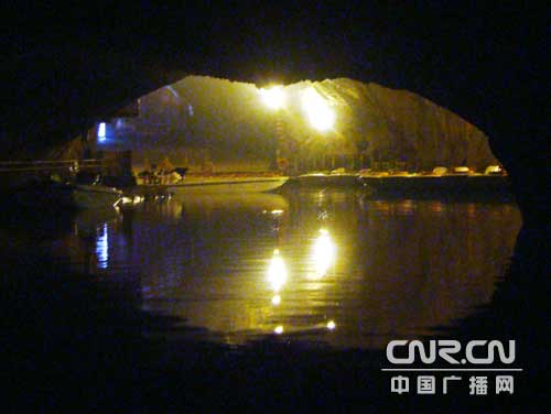 大厅正面,是通往水洞的码头,千余平方米的水面,宛如一座幽静别致的“港湾”,灯光所及,水中游船、洞中石景倒映其中,使人如入仙境。车友们从护岸石阶拾级而下,通过长廊从码头上船后开始畅游水洞。