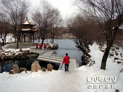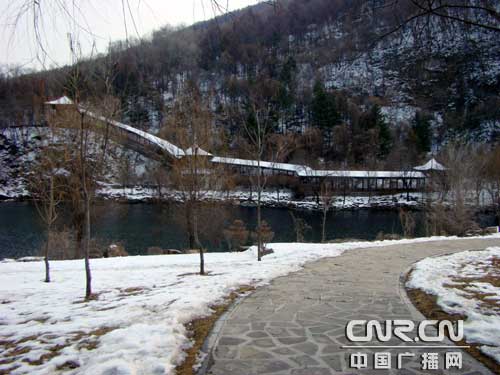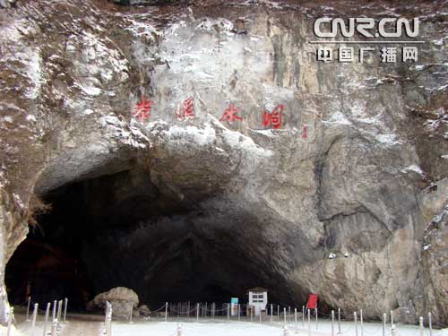 这里可能刚刚下过一场雪,整个水洞风景区周围到处是一片白雪皑皑的秀色。到底是旅游淡季,这里游人寥寥。来到售票处,发现票房已封门搬迁到了水洞景区办公室。车友们购票后顺着一条蜿蜒曲折的甬道向水洞入口走去。经过一个亭子,穿过一座小桥即来到了水洞的洞口。