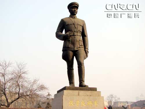 车友们抵达大帅府,首先看到的是位于帅府前广场上的一座张学良将军戎装雕像。这座雕像于2005年“西安事变”69周年纪念日落成。雕塑的设计者为鲁迅美术学院雕塑系教授张秉田先生。雕塑总高6.94米,上部是呈站姿身着戎装的张学良将军雕像,雕像将张学良的身材加高了一些,显得精神、挺拔。面部表情是微皱眉头,眼光深邃地望着远方,嘴唇紧闭显得坚定。身体姿态是直立的,一只手握皮带,一手下垂拿着手套。雕像高4米,下部是高2.94米的基座。基座上镌刻的“张学良将军”五个金色大字闪闪发光。