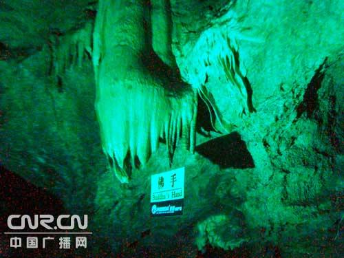 游船在曲折蜿蜒的河道中行驶。洞内的五颜六色的观景灯幽暗,虽然能看清沿途千姿百态的景观,但由于游船在洞中行,不可能用三角架对拍摄景观长时间曝光,所以一般的照相机很难拍出各景观的那种巧夺天工的实际效果。
