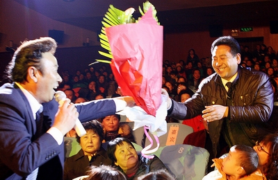 导演赵立君唱歌并给宋志永献花。