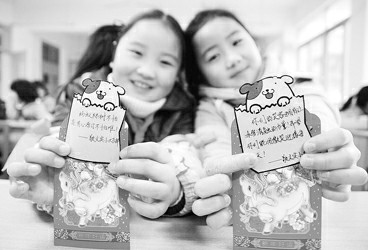 图为苏州敬文实验小学的两名女生展示老师发给她们“红包”里的祝愿卡