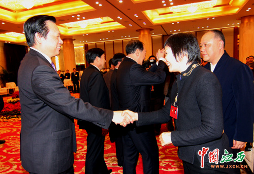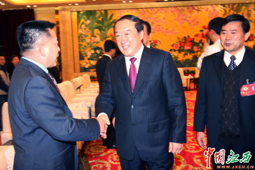 图为苏荣与港澳委员亲切握手。(江西网记者 邓小勇摄)