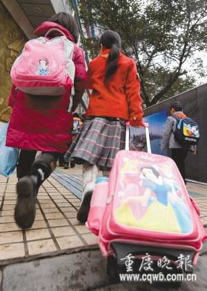 和阳阳一样的小学生还有很多。昨天,记者在渝中区、南岸区几所小学看到,学生们在新学期第一天就背上沉沉的书包,不少学生拖着拉杆书包上学。在渝中区某小学门口,五年级学生小蔡的拉杠书包里,还装着厚厚的新华字典,美术课用的油画棒、水彩画颜料。