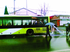 昨日中午12时57分,一辆938支9路公交车车头朝南停在事发车站,后车窗和左侧后部车窗玻璃破碎,近10根银色空心钢管插入车后部,两三根钢管进入车内长度有2米多深。