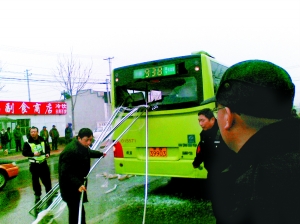 “肇事”钢管被取出。昨日12时许,通州区宋庄镇丁各庄村,一辆白色半挂货车由北向南行驶至丁各庄车站时,货车上多根6米长的空心钢管插入前方停靠在车站的938支9路公交车,公交车后部乘客和售票员共9人被送往医院。医生称,伤者均无大碍。多位目击者称,两车并非追尾。公交车后下部和货车前部也无破损。目前事故原因正在调查中。本报记者 李天宇 摄
