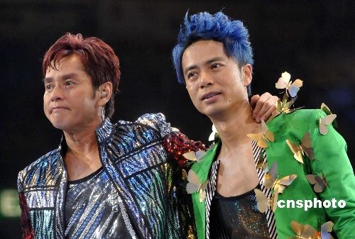 二月十四日晚,“香港二零零九东亚运动会.左麟右李演唱会”在香港红磡体育馆作尾场演出。图为歌星谭咏麟、李克勤特别为是次演唱会强身,两人演出时不忘展示麒麟臂及胸肌。 中新社发 邓庆乐 摄