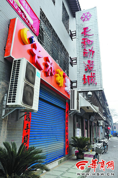“停业”、“装修”、“转让”的动漫城还有很多,含光门里“欢乐”、“银河”两家动漫城的门头已经拆除,大门紧锁,朱雀门里“超创”等两家动漫城的门头用布幔遮得严严实实,太白路“冒险岛”、大学南路“开心百分百”等贴出“转让”告示,龙首村附近原来一家正在装修的“酷点”动漫城也停止了装修,将门头全部拆除,更多的动漫城如西北大学南侧“环宇”动漫、环城西路“金鸵”动漫等均是“装修停业”。