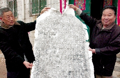 在靳先生家中,他小心翼翼地从保险柜中把已经发黄的宣纸拓片拿出来给记者看。“这是前年我们从挖出的一个古碑上拓的,上面的碑文十分重要。当时因为怕这个石碑被人破坏,挖出后,把碑上的泥土清理干净,拓了6张碑文,又连夜把这个石碑埋到地下了。”