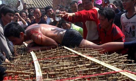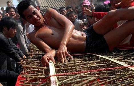 网友曝粤西民俗翻刺床 半裸村民刺条上翻滚(图)