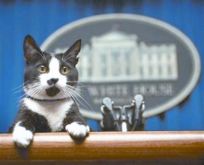 前白宫第一猫“袜子”起初不过是一只四处流浪的小猫,但1991年1岁大时,它有幸被克林顿女儿切尔西看中并收为宠物。由于它背部毛色漆黑,四个爪子却呈雪白色,如同穿了袜子一样可爱,因此被戏称为“袜子”。1992年,“袜子”随总统全家进入白宫,升格为“全美第一猫”。而从此开始,总统府就创办了一份《“袜子”报》,每期发行2万份。