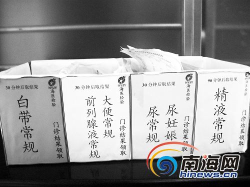 在海南医学院附属医院二楼急诊检验科,记者看到,检验科窗台外挂着一叠病人的化验报告,有好几个病人正在翻看。而三楼的检验科没有人上班,但窗台外放了一个小纸箱,纸箱是用来放置着白带常规、前列腺液常规、大便常规,尿常规,尿妊娠和精液常规六个项目的化验单。纸箱内放置了好多无人来领取的化验单,化验单多是前列腺液常规、白带常规和尿液常规的化验单。记者在一份白带常规的检验报告单上看到,检验标本是阴道分泌物,检查的项目包括清洁度、念珠菌、滴虫等项目。而与之对面的检验窗台上放了上百份血常规的检验单无人来领取。这些检验单的检验时间早的在2月5日,最近的在2月21日。