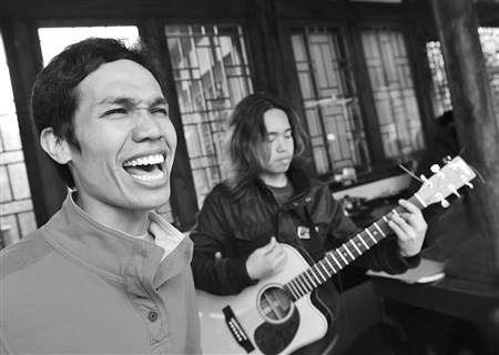 据介绍,两名歌手分别叫尔尼和马可,是来自菲律宾的民间歌手,曾在世界上许多国家进行过巡回演唱。咖啡屋负责人说:“3个月前咖啡屋开张时,为营造一种浪漫氛围,我们特别请了尔尼和马可来到成都。”尔尼和马可两名洋打工的出现,不仅为商家吸引了顾客的眼球,也为古朴的宽窄巷子增添了一道异国风景。记者朱建国摄影报道