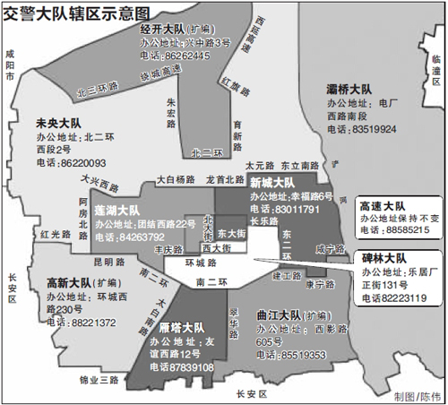 在本次调整中,从2月26日起撤销了原交通管理支队1至11大队,按照西安市的行政区域划分为新城、碑林、莲湖、雁塔、灞桥、未央、高新、经开、曲江等九个大队,名称为“西安市公安局交通警察支队××大队”,各个交警大队全部设置法制科。