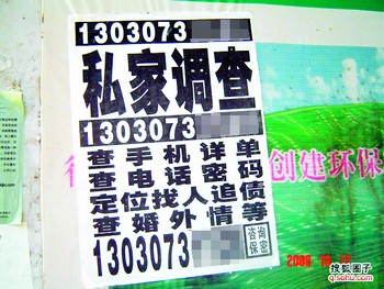 记者随便翻开一份报纸,“觅珍调查”、“鹰鹫天下”、“猫捕调查”、“诚信侦探”之类的调查广告屡见不鲜,上面赫然写着“专业诚信保密,商务婚姻债务调查,特快调话单”等字样。“这些人,实际上就是从事‘私家侦探’业务。”王志明介绍道。