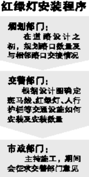 “设置红绿灯等交通设施,要过三道关,交警一家说了不算”。记者从有关部门获悉,安装红绿灯等交通设施是在道路设计时就要规划的。据了解,规划部门要先规划出道路上设几个路口,每个路口和相邻路口交接的情况。规划完成后,由市政部门主持施工。施工过程中,会根据设计规划向交警部门征求意见。交警部门则根据设计图纸确定斑马线、红绿灯、人行护栏等交通设施如何安装,以及安装的数量。