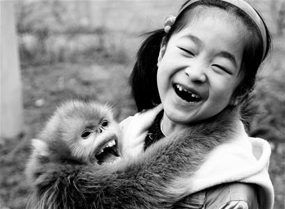 金丝猴的饲养员刘奇见小胡安与“成成”这般亲密,决定将小胡安带进馆内与“成成”来个零距离接触。于是,小胡安两边的衣服口袋里揣着金丝猴喜爱的胡萝卜、饼干等零食,激动又有些惴惴不安地跨进了金丝猴馆。这是她第一次与这些充满灵气、浑身金灿灿、动作轻盈而滑稽的金丝猴零距离接触。馆内5只可爱的金丝猴让她兴奋不已,尤其是“成成”,像明白事理一样,主动从树上直接纵身跳到小胡安的身上,双手紧紧环抱住小胡安的身体,不停张嘴发出“呲呲”声,而小胡安也咯咯地笑着,伸出双手与“成成”亲密拥抱。