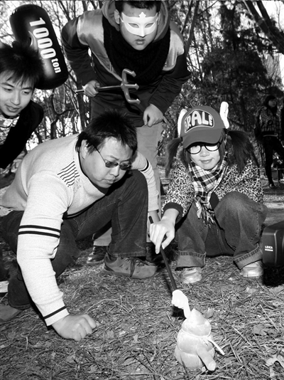 在紫竹院公园里,演员们奇怪的道具、卡通的装扮吸引了不少游客的目光。很多小朋友都睁大眼睛,看着哥哥姐姐手里奇怪的道具。一名中年游客说,虽然他不知道阿拉蕾,但还是觉得这个创意挺新鲜。