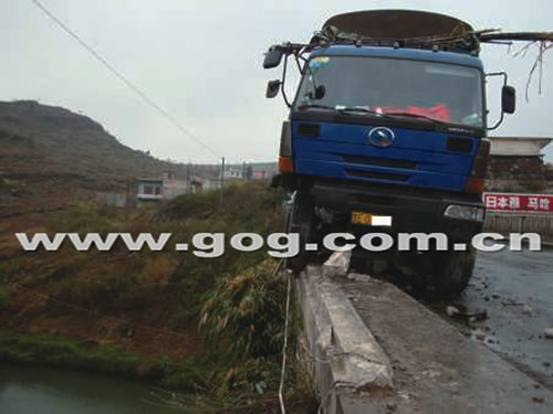 由于长时间的干旱,公路上积有一层比较厚的尘土,这两天阴雨连绵,雨滴和尘土稀释成一层类似于“润滑剂”覆盖在公路上,路面很容易打滑。据了解,驾驶员贺某于当日17时左右驾驶大货车从安龙往兴义方向行驶,行至国道324线2178公里230米处,为了占线超过两辆停在公路上大货车的位置,当他加大油门高速前进超车时,对面突然来了一辆两轮摩托车,车辆紧急制动,由于车速过快,加之路面太滑,车辆失控原地调头撞向桥缘栏杆,幸好有桥梁栏杆缓冲,车辆才悬空在桥缘上。否则,大货车将掉到30余米深的新桥河里,车上驾驶员一家三口均受伤。