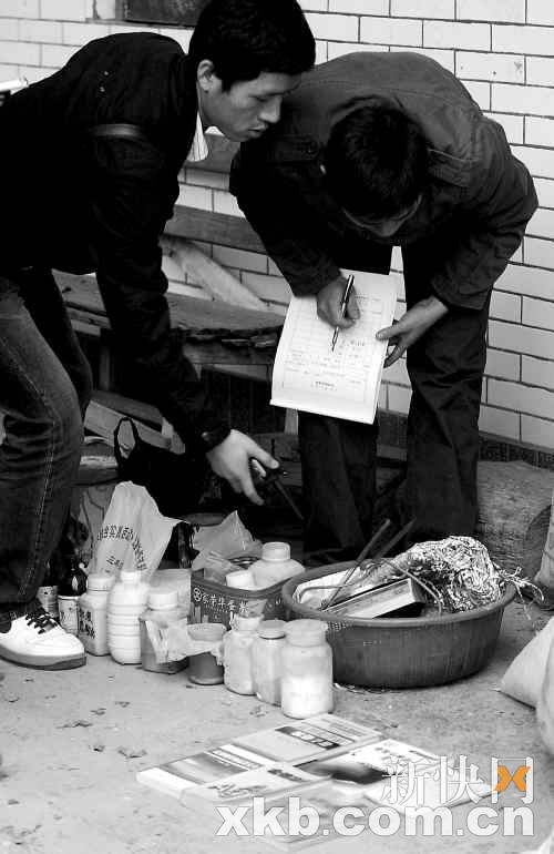 在事发居民楼前,堆放着一些警方从屋内搜出的证物。记者看到,地上有《民用爆炸技术》、《危险品安全》、《金银冶金》等五六本化学类专业书籍。旁边还摆着一些塑料罐和玻璃瓶,标签上写着“天拿水”和一些警示语,而这些容器内大都装有一些黑色或白色化学粉末。在一个纸箱内装着精密电子秤等量器。昨日下午5时30分许,警方将这些物证拿走。记者看到,警方还从屋内搬出了至少10个编织袋,有村民猜测说,编织袋内可能是制作爆炸物的原材料。
