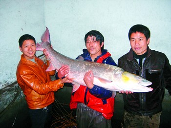 3月1日晚8时多,渔民夏子忠和妻子在湘江五桥江段撒网捕鱼。当他收网时,感觉网越来越重,并且在四处晃动。由于渔船小,他们急忙将船往岸边划。靠岸后,夫妻俩在闻讯赶来的亲戚帮助下才把鱼拉上来。昨日,记者在夏子忠家中看到了这条仍在水池中翻滚的大鱼。几位慕名赶来的渔民表示,他们捕鱼多年,也从没看到这么长的鱼。
