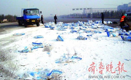 路口车相撞化肥撒百米 大众网-齐鲁晚报 2009.03.0407:10 关注 3月3日早晨,在临沂经济开发区205国道和327国道交会的十字路口,一辆满载化肥的货车与另一辆货车不慎相撞,化肥撒了一地,白花花的,长达100多米远。幸好车祸未造成人员伤亡。 记者周升海摄
