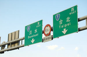 位于台北的一个交通标牌,“淡水”用通用拼音标注为“Danshuei”,“台北”标注为“Taipei”。