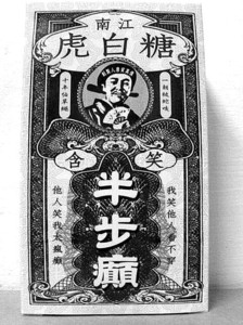 这种又名“江南糖白虎”的零食采用手掌大小的纸盒包装,盒身呈墨绿色,正面几个大字写明“含笑半步颠”,再配以所谓“制作人唐寅真像”。有趣的是,这个“唐寅”晃眼一看竟与周星驰《唐伯虎点秋香》中唐伯虎的扮相十分神似——嘴角微微上翘,手持一柄小扇,得意洋洋。