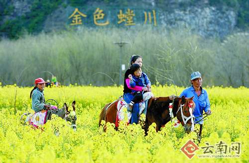 再往前走三四公里,就到“金色螳川之旅”的中心位置——牧羊湖。在这个季节,牧羊湖周围的油菜花开得黄灿灿一片,螳螂川边的四五个大水车在不紧不慢地转动,一幅田园牧歌似的秀美画卷赫然呈现。游客走过一段土路可以下到螳螂川边,也可以花10~20元骑当地农户提供的马或驴在油菜花海中穿行,那种怡然自得的心情只有到了才能体验。