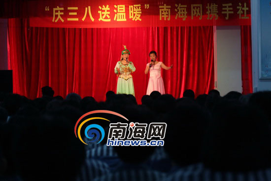 南海网3月6日消息(本网记者李晓梅)在6日上午南海网“庆三八送温暖”的活动中,歌舞演出让整个慰问帮教活动充满着温馨和欢乐,使整个活动进入长久的高潮,海南省红十字协会金秋文工团的女性歌唱演员们,及海南司法厅“高墙之声艺术团”女服刑演员们,一起用特殊的情感,共同演绎了高墙内外的艺术心声,庆祝这个属于她们的共同的节日。