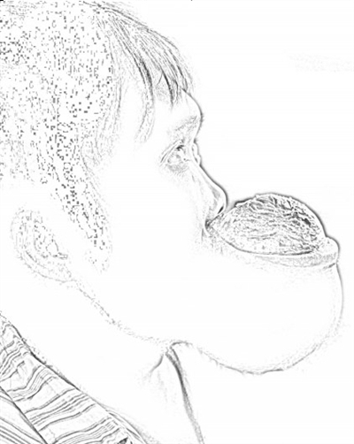 左图为“河马人”王金良。(原图可能引起读者心理不适,本报进行了素描处理。)本报实习记者王苡萱摄
