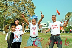 在传统醒狮锦标赛当天,现场击鼓最出彩的无疑是祖孙三代鼓手,他们演奏的“三代人四季鼓”引来阵阵喝彩声。来自白云区长红村的陈耀雄和70岁的父亲陈秋焕、11岁的儿子陈哲铭三代人,用鼓完美演绎了春夏秋冬四季的风雨雷电、丰收喜悦等声响,令人陶醉。