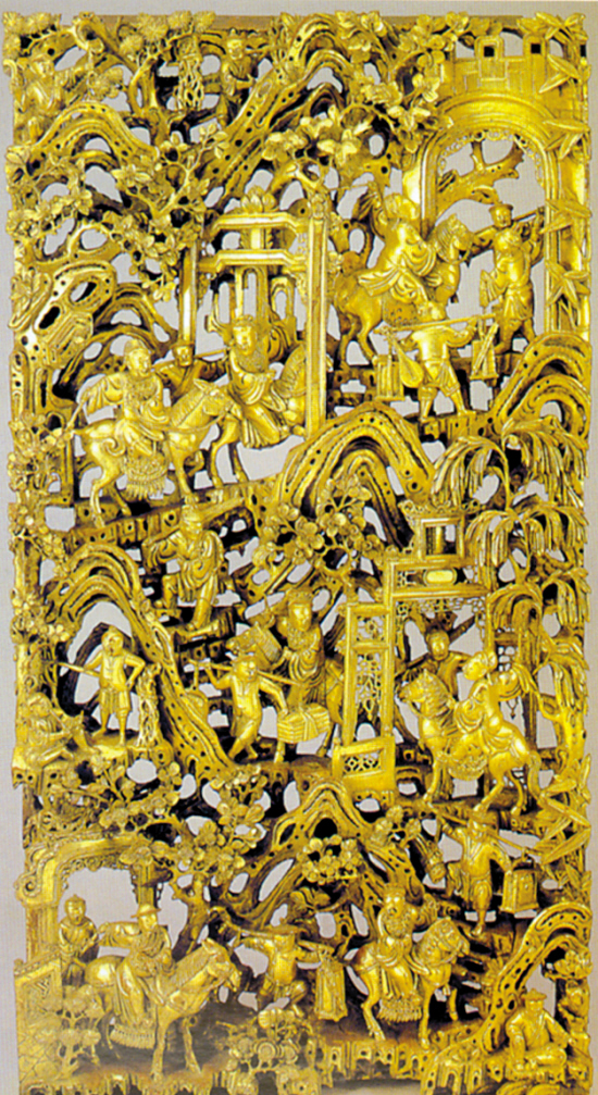 赵先生说,收藏潮州木雕,最好收集有年份的,因为老木雕的工艺远远胜于当代的作品。其次是收藏“金漆木雕”。所谓“金漆木雕”,就是将金箔贴在木雕表面,而不是用金水涂漆,加上金箔后的金漆木雕寿命比普通木雕可延长近百年。